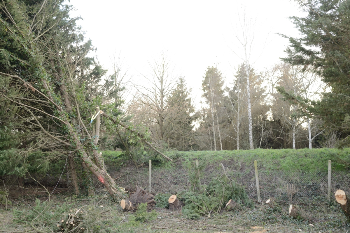 Mars 2020 : nouveau gros coup de vent. La haie d’arbres le long de la route finit de se coucher sur 40 m