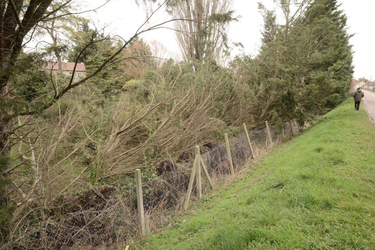 Novembre 2019 : après de fortes pluies puis un gros coup de vent la haie d’arbre bordant la route se couche sur 15 m